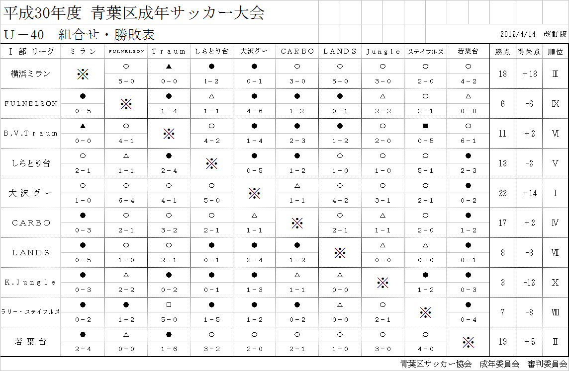 2019年度 青葉区成年サッカー大会 日程表・勝敗表U-40 組合せ・勝敗表(T部 リーグ/U部 リーグ)
