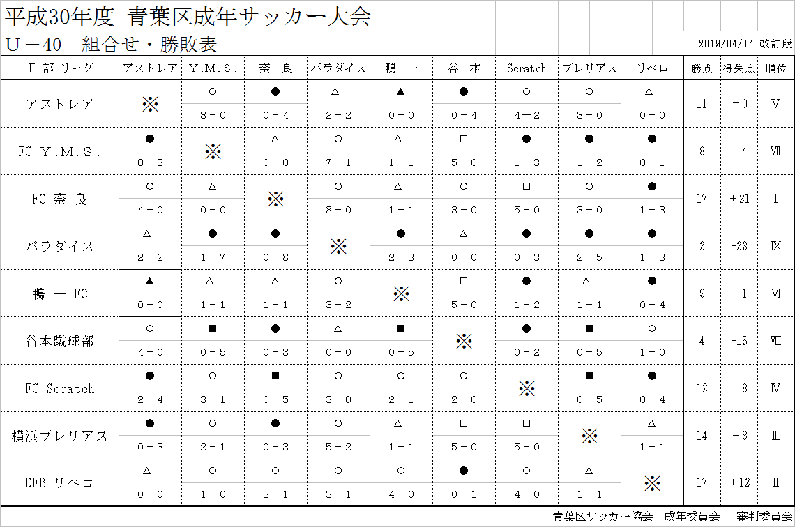 2018年度 青葉区成年サッカー大会 日程表・勝敗表