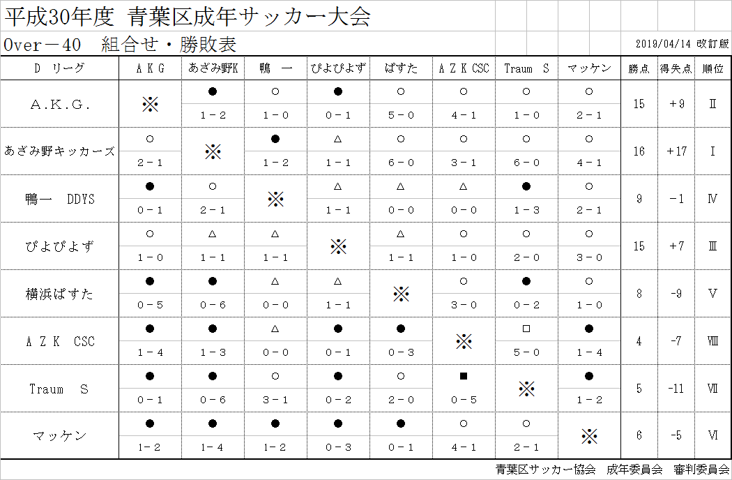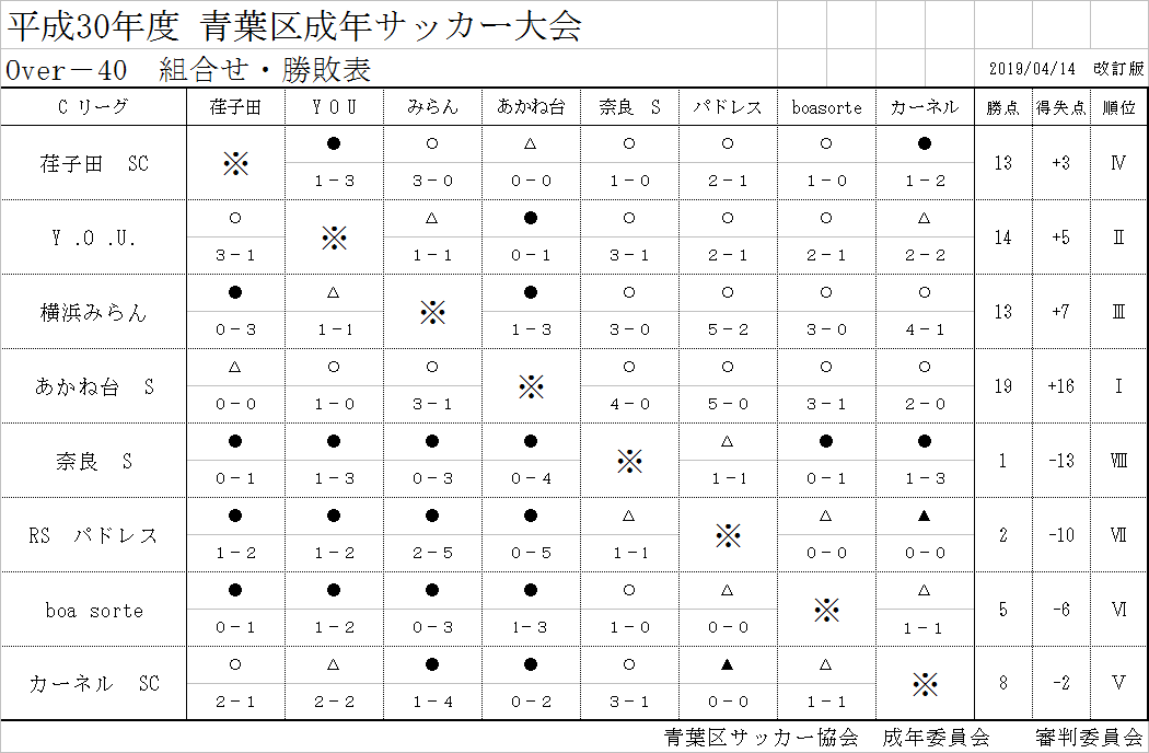 2019年度 青葉区成年サッカー大会 日程表・勝敗表